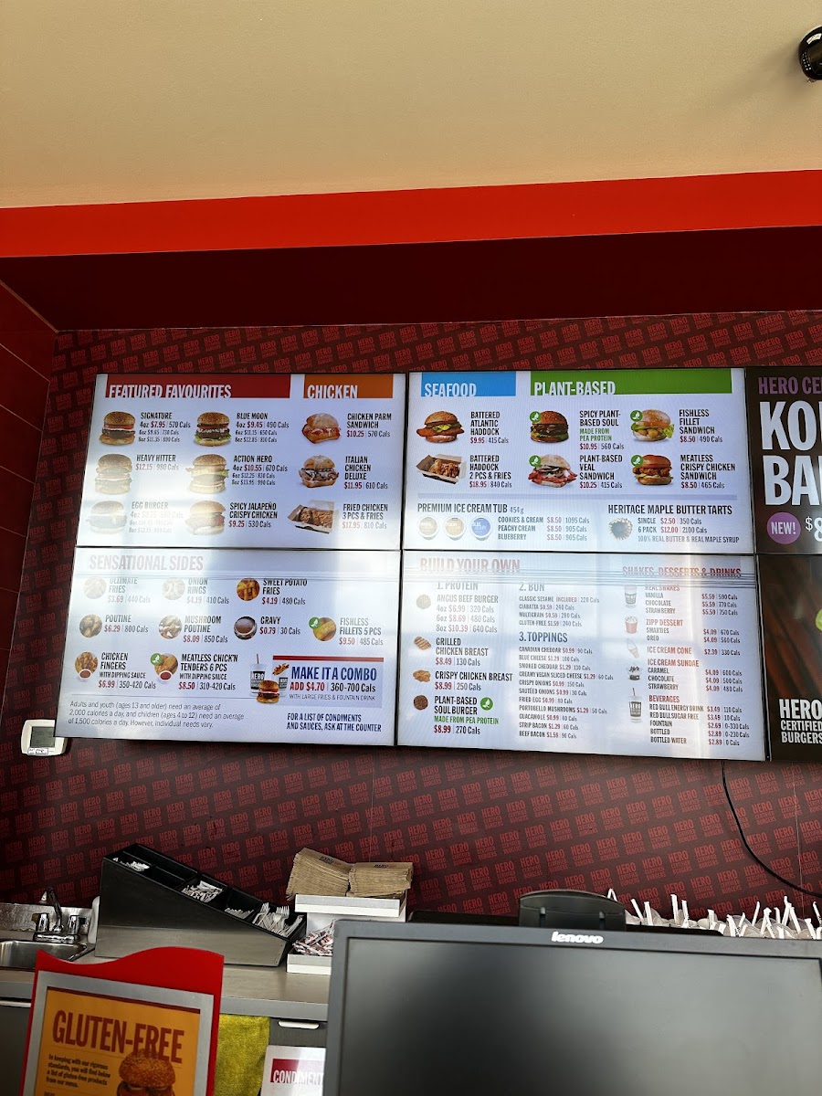 Sesame Poppyseed Bun, 100% Seasoned Angus Halal Beef Patty, Relish, Tomato, Onion, Real Canadian Cheddar Cheese, and Hero Certified Sauce. 650 Cal